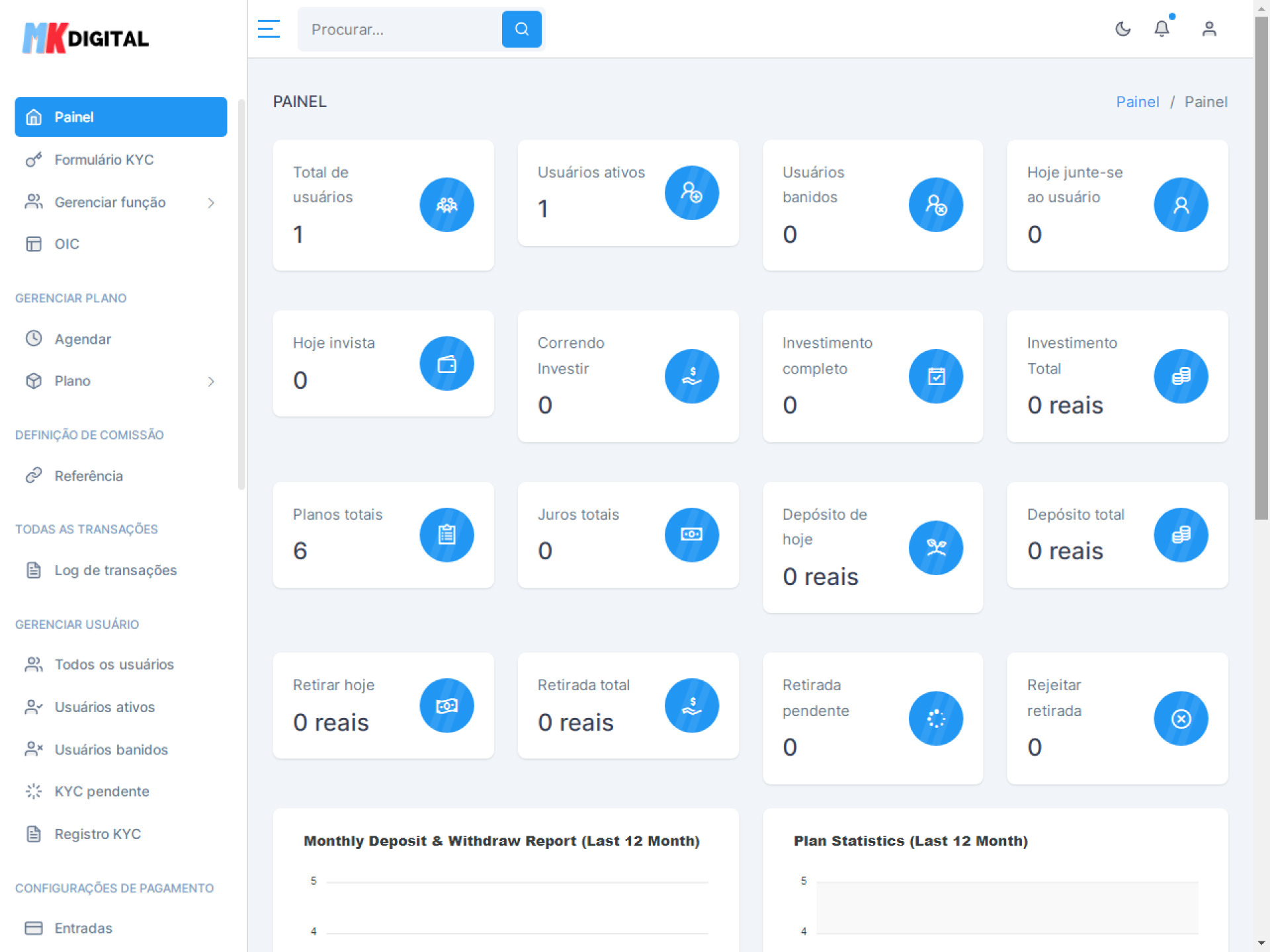 Plataforma de investimento on-line Multiprrpose Wallet e Banking. É uma plataforma web totalmente funcional para gerenciar sua carteira, plataforma bancária e de investimento online de maneira conveniente. Ele permite que você registre usuários, receba depósitos, remeta ganhos e processe ganhos de ROI de nível único e multinível. você poderá configurar sua própria plataforma o mais rápido possível. Os principais gateways de pagamento e criptomoedas suportados incluem Stripe, Coinpayments (BTC, ETH, LTC, DASH, XRP e BCH) e Paypal.