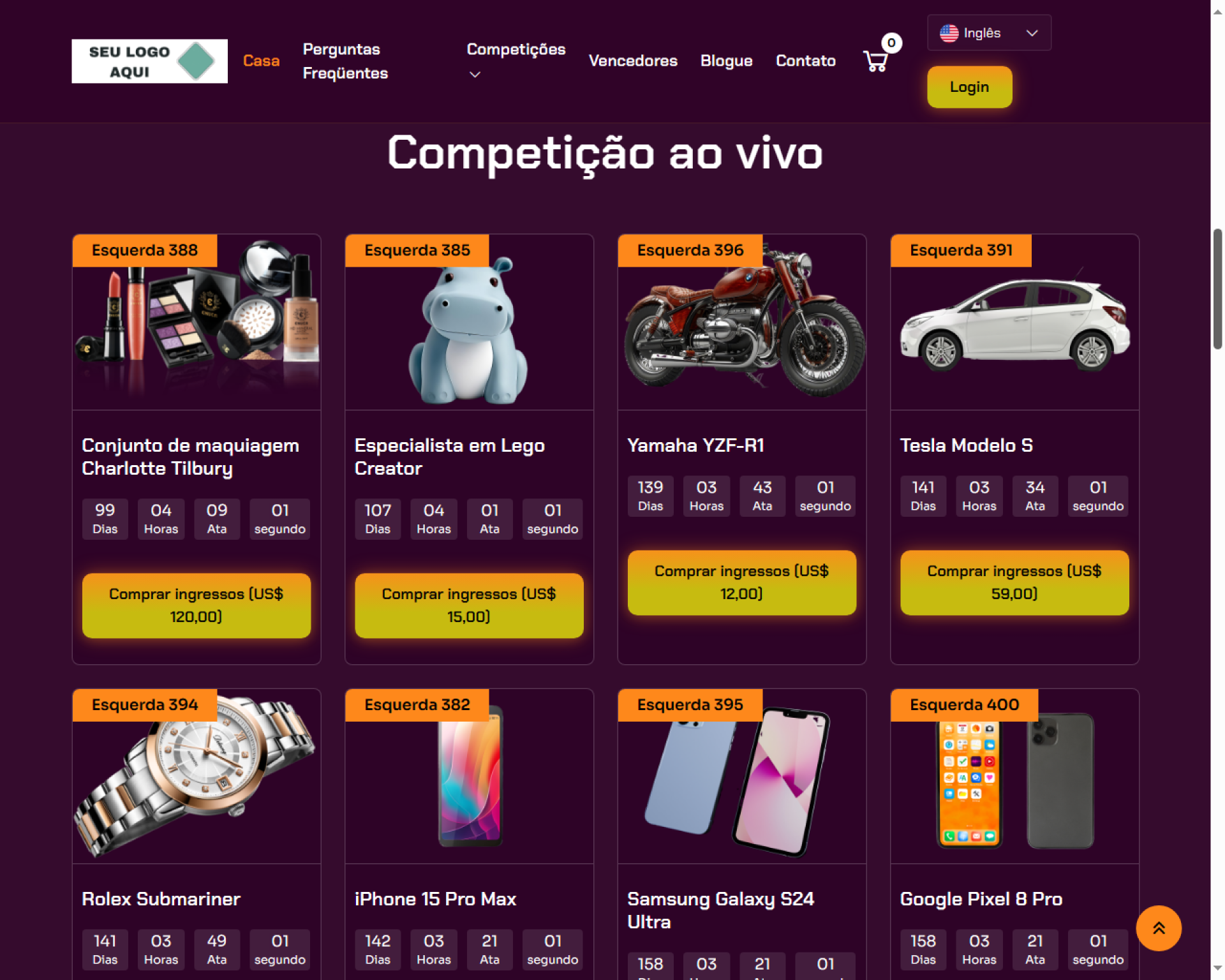 Compre ingressos para ter a chance de ganhar uma variedade de recompensas incríveis. Nossa plataforma é perfeita para quem gosta da emoção da competição e da possibilidade de ganhar muito. Com várias competições e sorteios aleatórios, as oportunidades são infinitas. Esteja você buscando carros, eletrônicos ou mais, nossa experiência perfeita garante uma jornada envolvente e gratificante, desde a compra