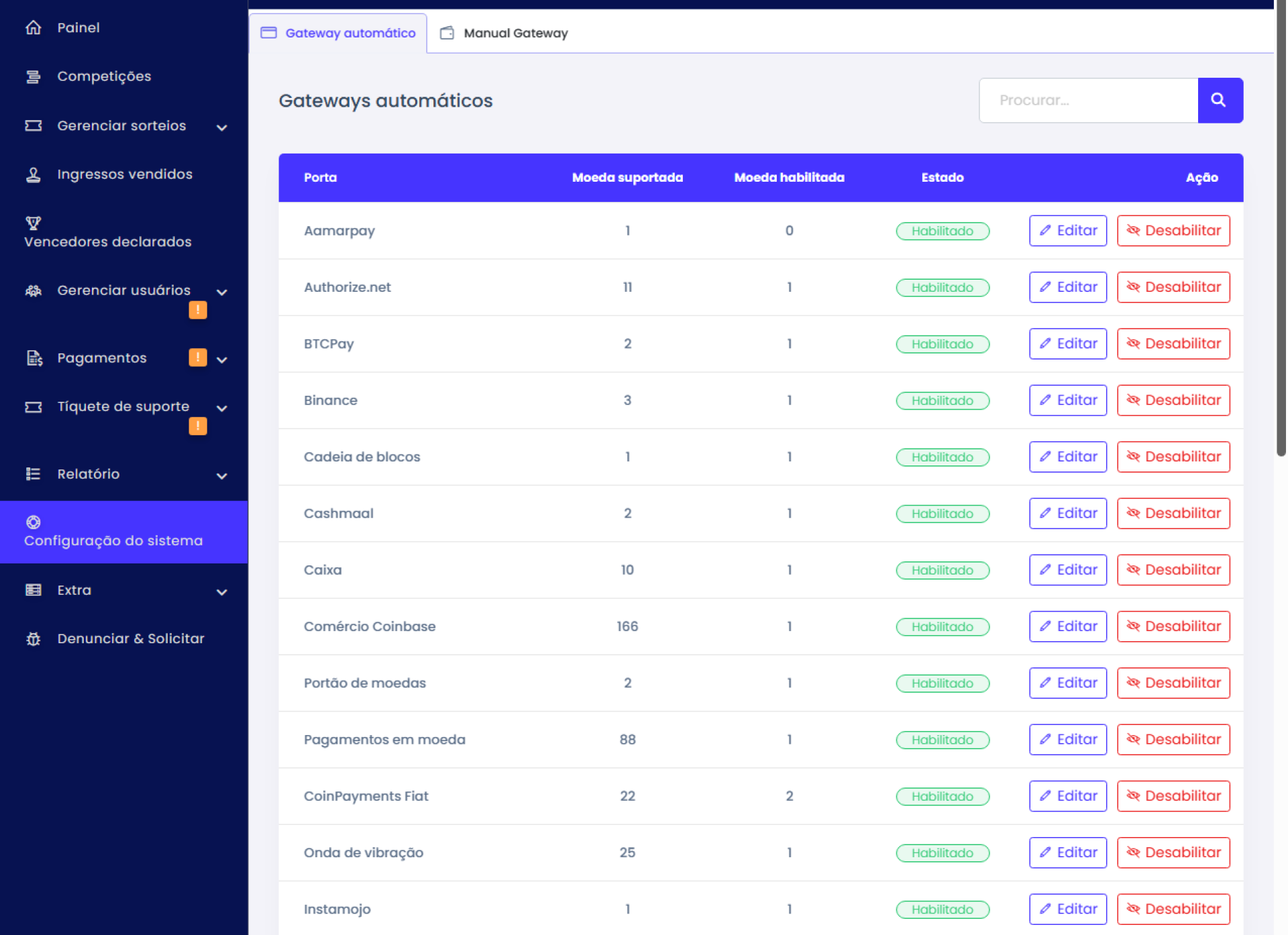 - Gerenciar gateways de pagamento.