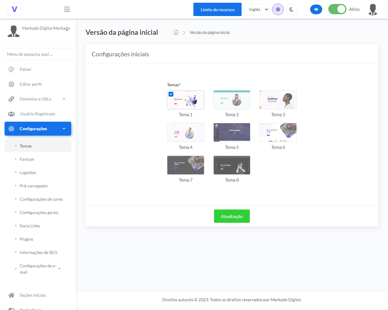 - Personalizar cores, logotipo, pré-carregador e outras configurações.