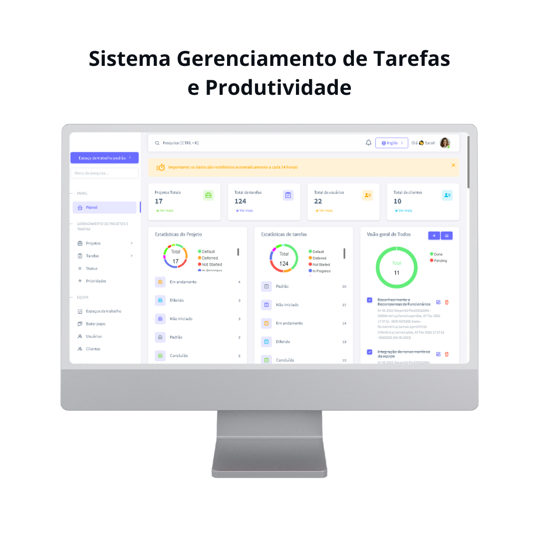 Visualize projetos, tarefas e métricas de produtividade em um painel intuitivo. Acompanhe aniversários da equipe, datas importantes e membros em licença.