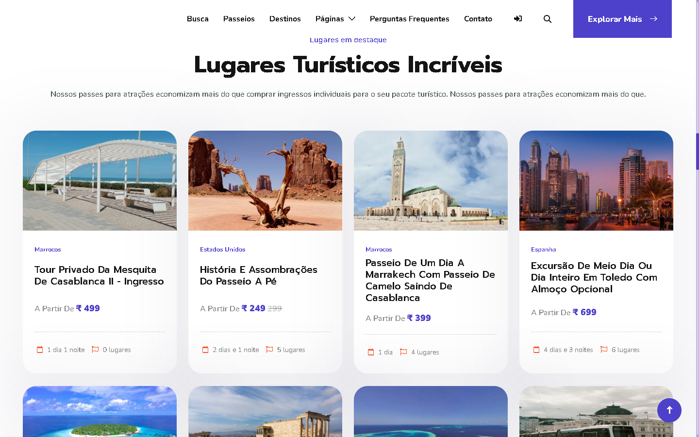 O sistema permite que vários vendedores como guias locais, agências ou empresas de turismo se cadastrem, listem suas próprias experiências de viagem e gerenciem reservas a partir de um painel personalizado. Cada vendedor pode aceitar pagamentos diretamente usando suas próprias credenciais de pagamento, oferecendo flexibilidade e reduzindo a sobrecarga operacional para o proprietário da plataforma. Possui 3 layouts modernos de página inicial e 3 estilos de exibição de pacotes.