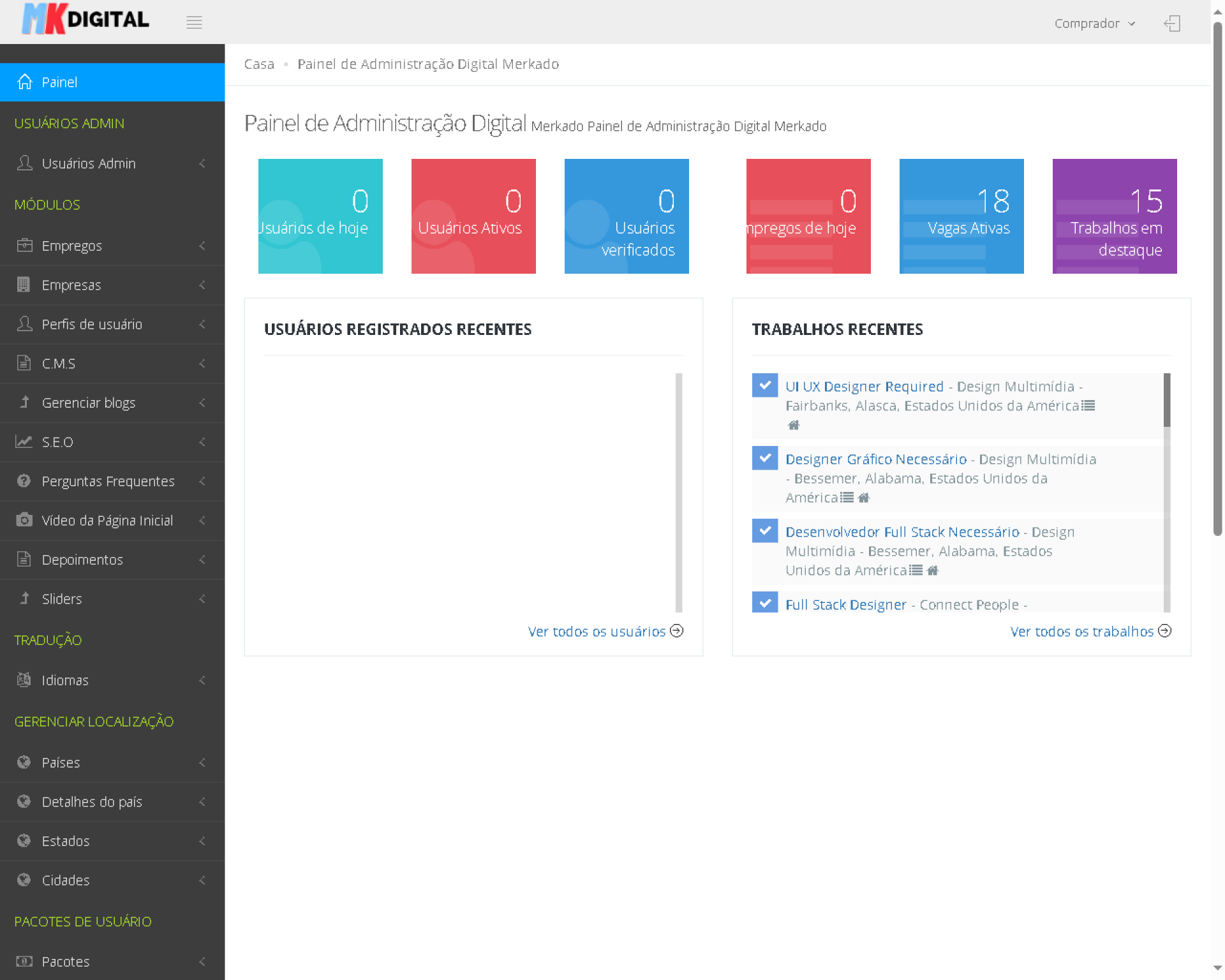 O módulo administrador tendo todos os privilégios sobre todo este projeto, ele pode atualizar, excluir e modificar os detalhes sobre candidato a emprego, provedor de emprego, CMS, atributos de trabalho, usuários Admin etc. O administrador mantém o banco de dados de clientes e candidatos a emprego, onde quer que o cliente esteja liberando seus requisitos (vagas) com habilidades e experiência primárias específicas, nesse momento o administrador procura por candidatos a emprego, que estão tendo essas habilidades e experiência primárias.