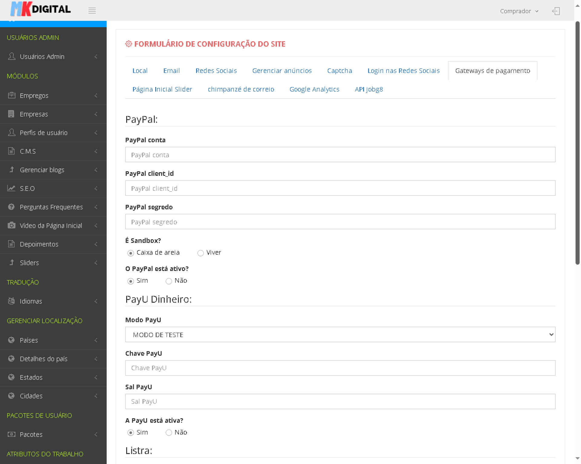 - Gerenciar configurações do site